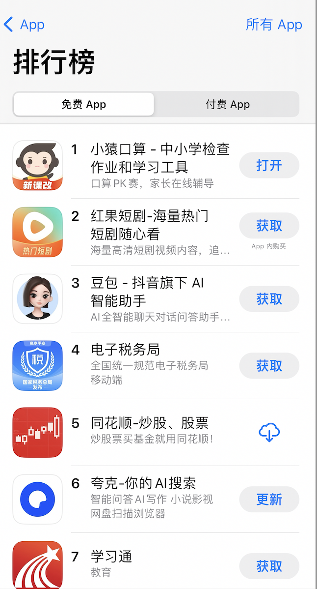 【雷竞技app下载安卓 讯】10月11日,小猿口算登顶苹果App Store免费榜,排在其后的分别是抖音旗下的AI智能助手豆包、阿里旗下的夸克,以及同花顺等知名软件。