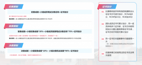 ● 比赛期间选手持有效的锐捷职业认证证书方可进行加分,RCNA加5分、RCNP加15分、RCIE加30分;