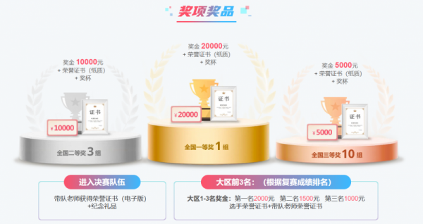 在奖励方面,大赛设置了极具吸引力的奖金与荣誉:冠军团队1组,将斩获2万元奖金+证书以及奖杯奖励,亚军团队共有3组名额,每组将获得1万元奖金+证书及奖杯,季军10组,每组将获得5000元现金奖励+证书及奖杯。此外,复赛大区1-3名将获得相应的奖励,第一名2000元 第二名1500元 第三名1000元,选手荣誉证书+带队老师荣誉证书。