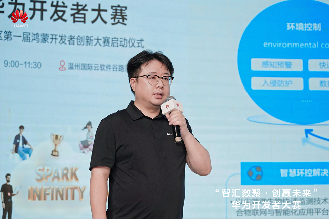 华为云开发者生态赛事运营经理郑彭元随后详细介绍了大赛规则与亮点。本次大赛紧密聚焦区域内产业转型升级与企业创新发展需求,设置多元赛道与丰富奖励机制,旨在挖掘一批基于鸿蒙系统的创新应用项目。根据大赛设置的权益,获奖项目将获得华为技术认证、云资源支持及温州本地产业对接机会,优秀团队更有机会入驻温州国际云软件谷孵化。