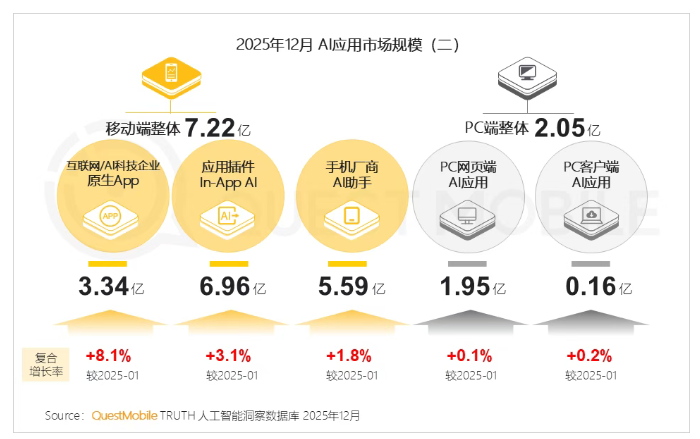 QuestMobile数据显示,截至2025年12月,国内四类AI应用活跃度全面提升。其中,“应用插件(In-App AI)”用户规模高达6.96亿,成为目前用户触达最广的AI形态;而原生App则保持着强劲的复合增长率。