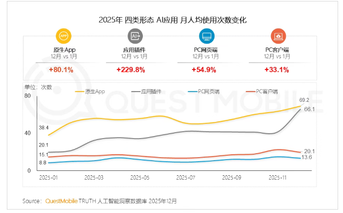 数据印证了插件形态在培养用户习惯上的高效:2025年12月,应用插件的月人均使用次数较1月暴增了229.8%,远高于原生App 80.1%的提升幅度。这表明,在熟悉的既有场景中“顺手调用AI”,正成为高频且稳固的用户习惯。